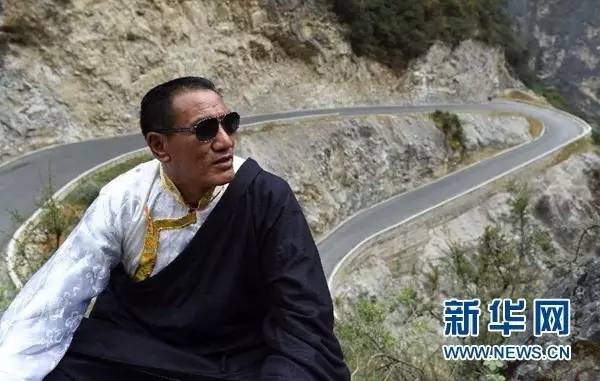 ▲斯那定珠在香格里拉大峡谷内仰望远方(他的一只眼睛近乎失明,经常戴着墨镜),身后是其倾尽所有修建的其中一段公路(5月14日摄)。新华社记者 蔺以光 摄
