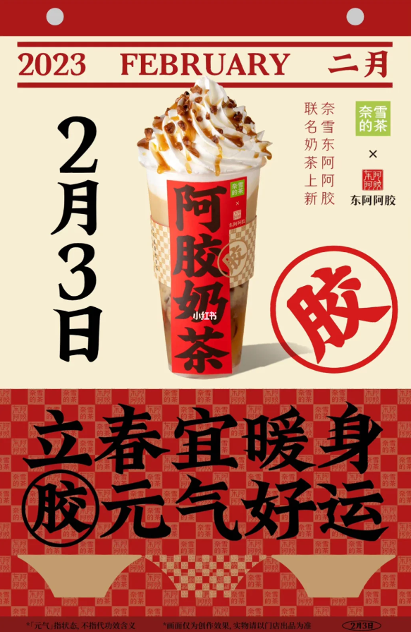 日前,奈雪的茶发布消息,宣布与东阿阿胶联名推出阿胶奶茶,新品将于2月3日正式上线,突出“立春宜暖身,胶元气好运”的理念。(信息来源:品牌官方)