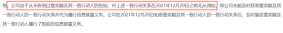 - 2022年1月12日,公司披露问询函回复公告显示,2021年5月26日,章奕颖等6人合计持有公司股份 8,458,956 股,占公司股份总数的5.096%,首次超过5%。但上述股东未停止交易并及时披露权益变动报告书,也未及时披露存在一致行动关系。