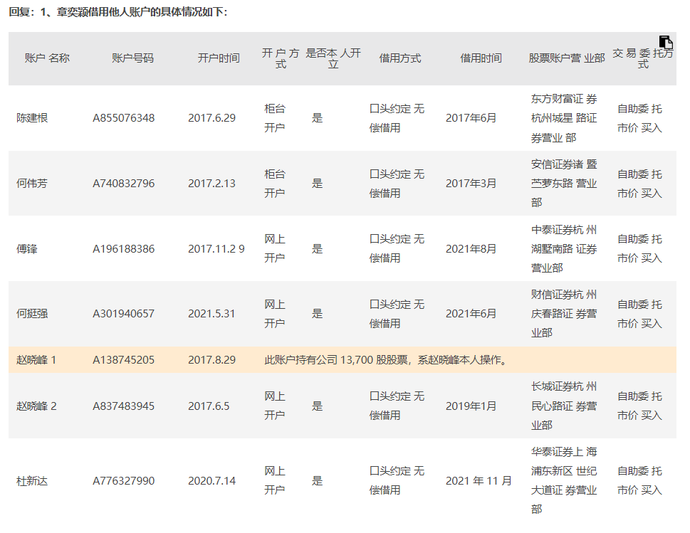 界面新闻记者发现,章奕颖通过口头约定借用了6人的6个股票账户,这些账户的营业部也多集中在杭州市,比如陈建根的开户地址在东方财富证券杭州城星路证券营业部。