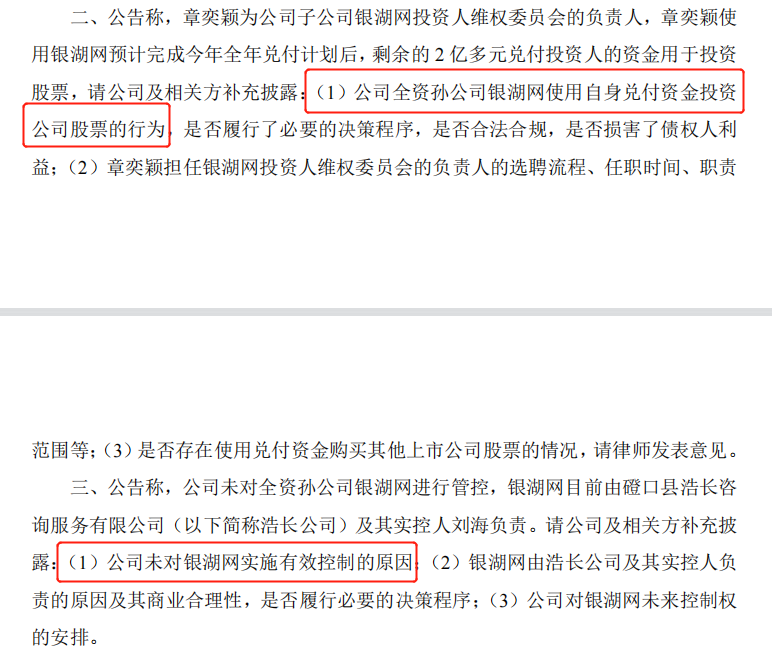 彼时监管层问询,公司全资孙公司银湖网使用自身兑付资金投资公司股票的行为,是否履行了必要的决策程序,是否合法合规,是否损害了债权人利益;公司未对银湖网实施有效控制的原因又十什么?