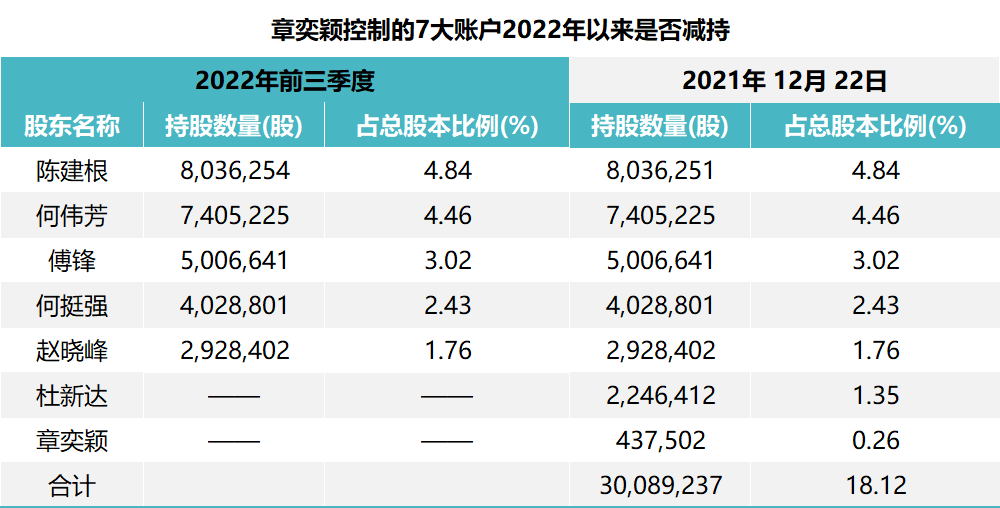 界面新闻记者发现,截至2022年9月30日章奕颖及一致行动人持有的3009万股大概率并未减持。因为与2021年12月首次披露的持股数据相比,其中5名一致行动人的持股比例和持股数量并无变化。
