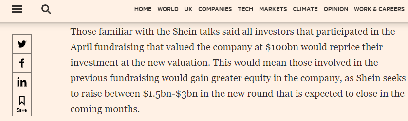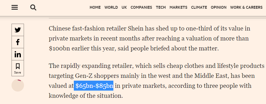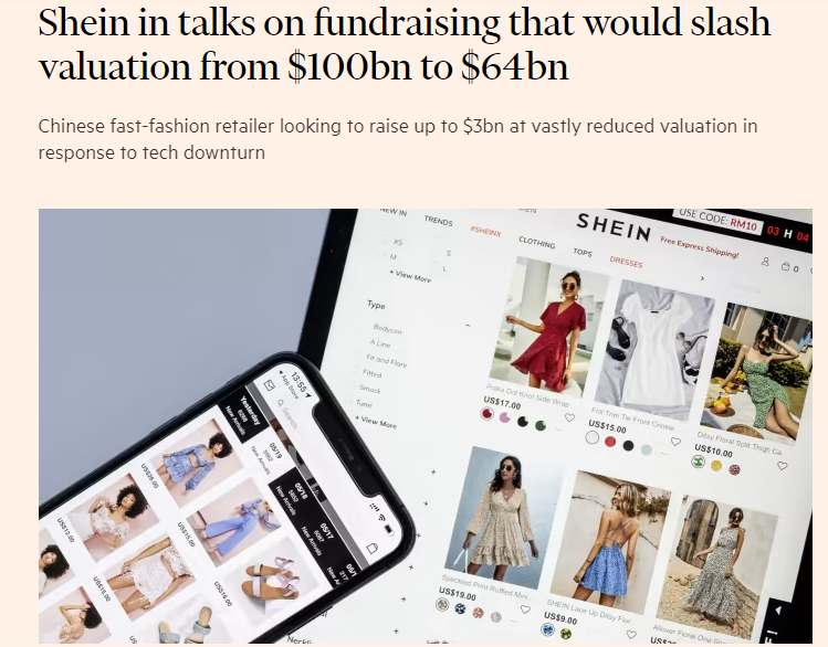 如今不到一年估值缩水三分之一,这一情形并非空穴来风。据2022年10月的英国《金融时报》,据三位知情人透露,当时SHEIN的一级市场估值已经下调至650亿-850亿美元区间。