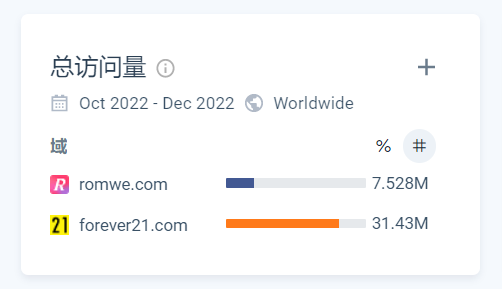 ROMWE与全球著名快消服装品牌forever21访问量比较,来源:similarweb