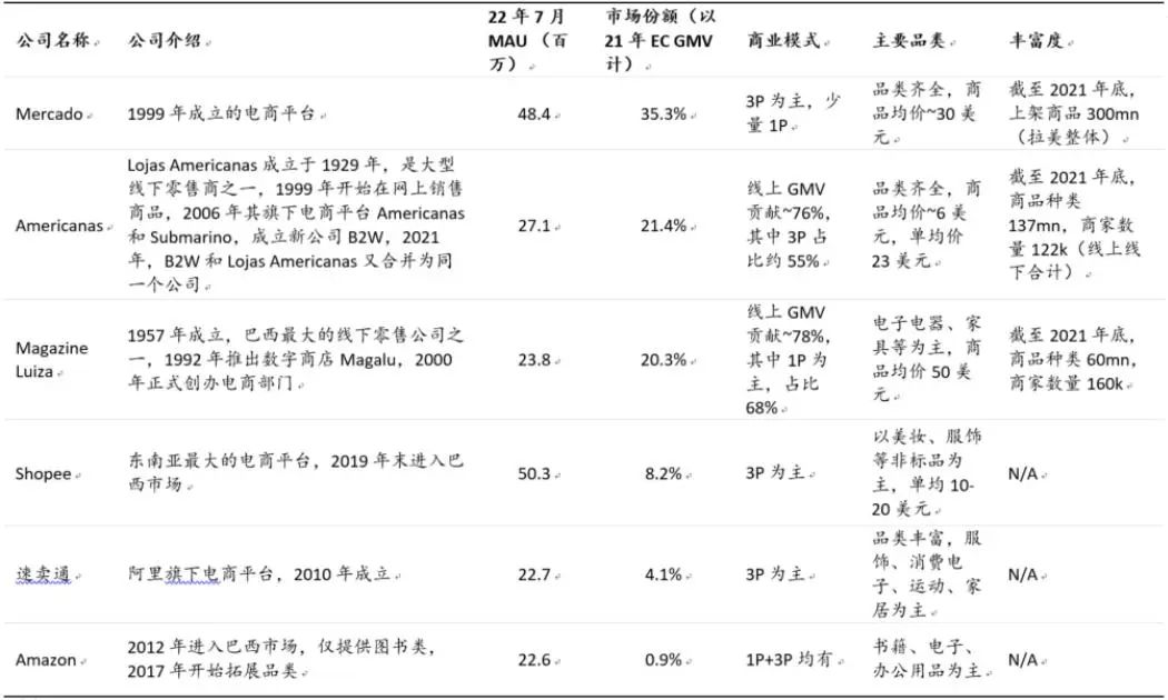 按2021年市场占有率排名,前三名皆为拉美或巴西本土电商平台、或线下零售商转线上,合计占有近74%市场份额。但Shopee、速卖通、亚马逊等境外电商近年来开始渗透进入巴西。