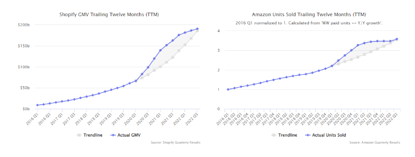 Shopify过去12个月GMV (TTM)和亚马逊过去12个月销量(TTM),来源:Marketplace Pulse