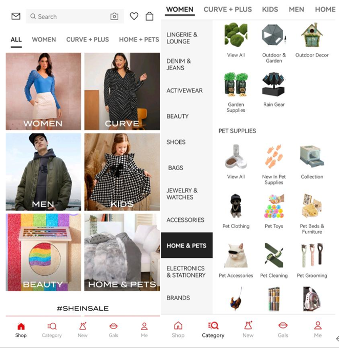 从新增百货品类看,除了老本行女装,家居、园艺工具、宠物用品成为SHEIN新扩充的经营品类。