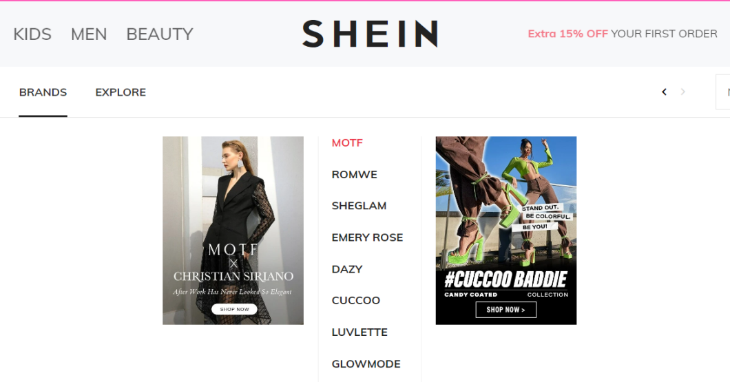 目前,SHEIN已孵化十个子品牌,包括年轻快时尚ROMWE、熟龄女装EMERY ROSE、美妆SHEGLAM、高端服装MOTF、韩风服装DAZY、鞋履Cuccoo等。除宠物PETSIN和3C电子产品 JMMO,其余品牌均设有独立站。