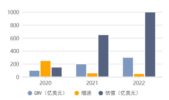 2020年-2022年SHEIN增速、GMV和估值对比图。来源:各媒体报道,阿尔法工场整理
