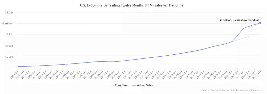 但值得担忧的是,随着疫情带来的“红利”效应褪尽,美国电商行业几乎告别了超额增长,回落到疫情前的趋势线。
