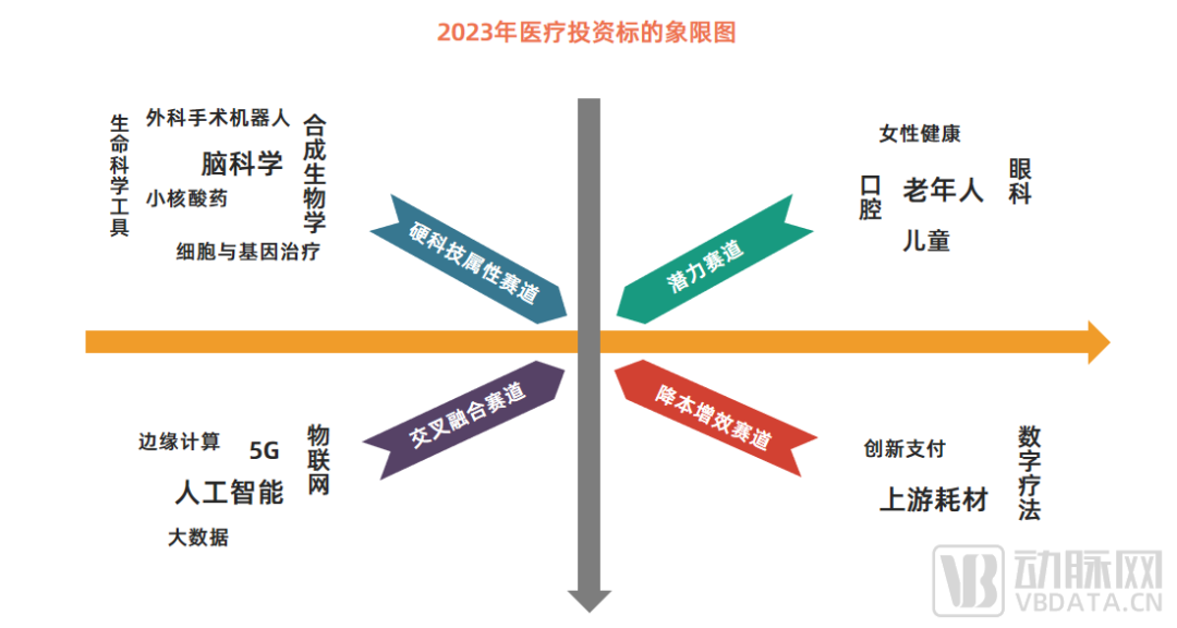 第二类是有着巨大市场空间但还处于早期发展阶段的潜力赛道,典型的代表是“银发经济”,即在医疗场景下老年人的健康需求。据悉,在动脉网此次采访的13家投资机构中,有超过一半的机构都将其作为2023年的重点投资方向。除此之外,在这一类别中,眼科和口腔也都被投资机构多次提及。