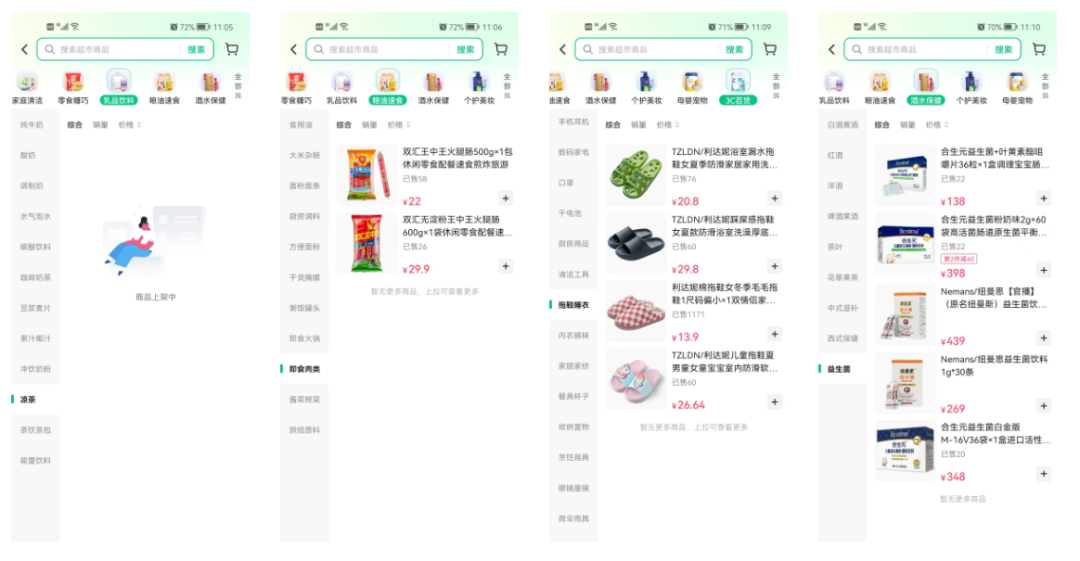 从抖音超市页面来看,目前有乳饮冲调、纸品洗衣、酒水保健、3C百货等9大常见的超市品类。其中并无生鲜品类,3C数码品类仅有苹果手机、平板、耳机部分产品,除了纸品洗衣、零食糖巧之外,各个品类还在建设之中: