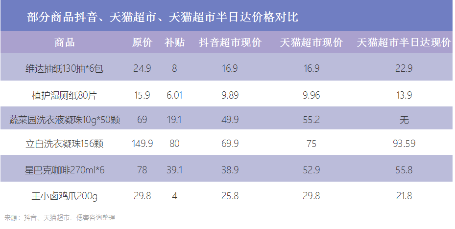 官方补贴部分才是差距所在。以上随机列举的个护与食品(都不在每日秒杀之中),抖音渠道要比天猫便宜一点。