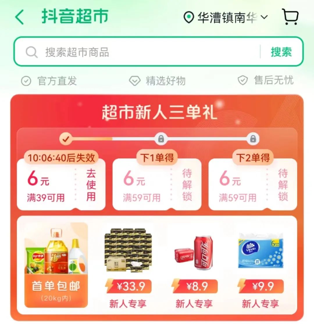 新人券与抖音支付券是实打实的一次性福利,天猫与京东都有过“超市新人礼”、“白条开通优惠立减”等,形成不了太大的差异。