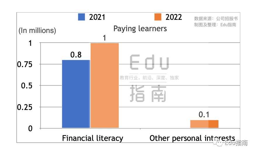 该项收入主要包括其向学习者收取的课程费用,例如金融知识等课程费用。招股书称,个人在线学习服务增长来自:1)金融素养课程增长47%,同比增加了7亿元收入,2)其他兴趣课程收入增加至1.9亿元。上述业务增长的原因包括该公司旗下高级金融素养课程平均价格提升,以及课程学习者增加。