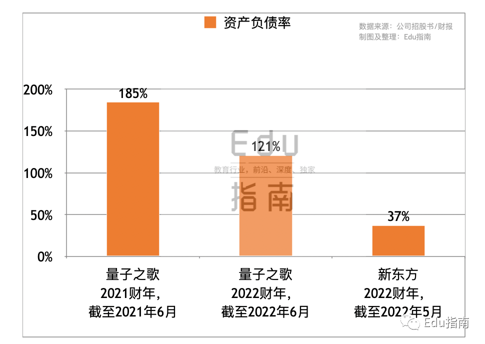 最新财年中,量子之歌总资产为6.03亿元,总负债为7.29亿元,资产负债率达121%,相较2021财年的185%有所改善。但当前该公司资产负债率仍然偏高,即该公司资金来源中较多来自负债,财务风险相对较高。头部教育公司例如新东方最新财年资产负债率为37%。相较而言,若要降低财务风险,量子之歌该项负债率未来仍有待进一步改善。