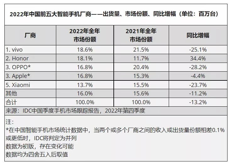 IDC日前公布的数据显示,2022年全年,中国智能手机出货量约为2.86亿台,同比下降了13.2%,创下有史以来最大的降幅。