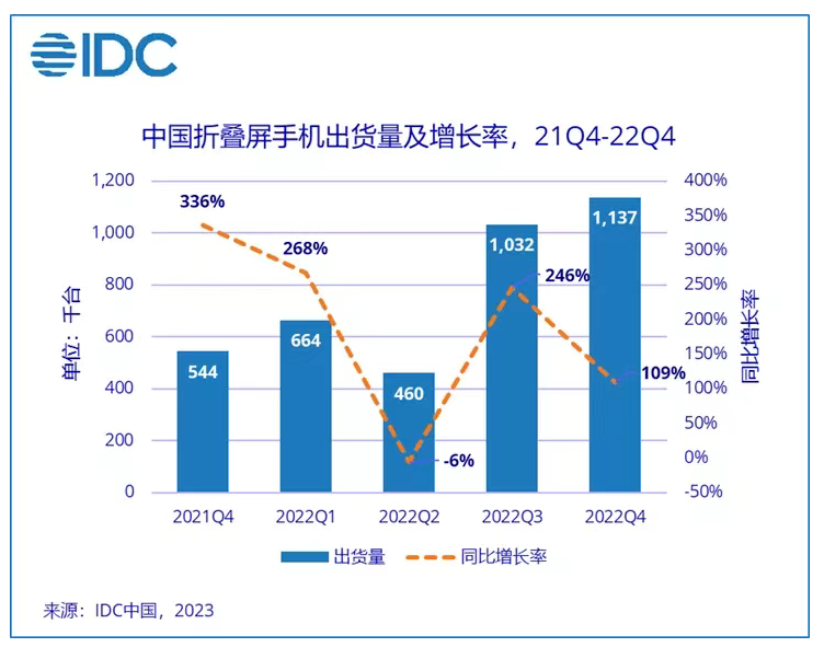 2022年,中国市场折叠屏手机的全年出货量近330万台,同比增长了118%。其中,仅仅在第四季度,出货量就有110万台。