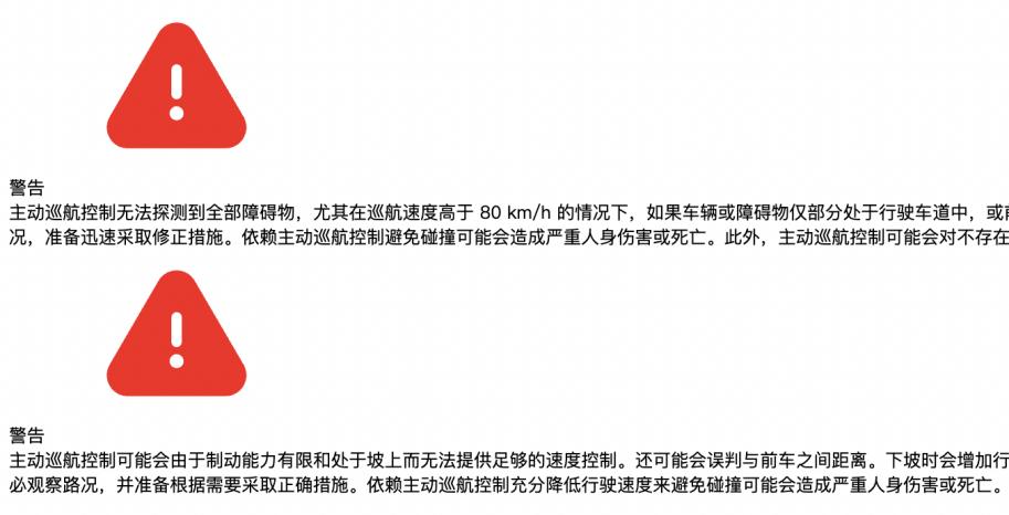 在特斯拉官网中,关于主动巡航功能的说明明确写道:主动巡航控制无法探测到全部障碍物,尤其在巡航速度于 80 km/h 的情况下,如果车辆或障碍物仅部分处于行驶车道中,或前车驶出您所在的车道后,车辆前方出现一辆静止或行驶缓慢的车辆或障碍物,则主动巡航控制可能不会实施制动/减速。务必注意前方路况,准备迅速采取修正措施。依赖主动巡航控制避免碰撞可能会造成严重人身伤害或死亡。此外,主动巡航控制可能会对不存在或不在所行驶车道上的车辆或物体做出反应,造成Model 3不必要或不当减速。
