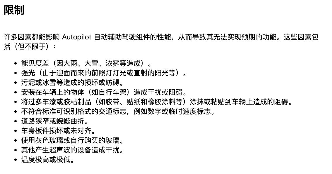 还有个题外话,在特斯拉的产品手册中明确写道,恶劣天气会对Autopilot的性能产生影响。按照常规认知,雨、雪、雾等恶劣天气下,也会影响人眼的感知能力,再加上轮胎或存在抓地力低的情况,更容易发生交通事故。驾驶辅助的初衷是提升行车安全,结果在恶劣天气下性能要受限,挺让人搞不懂的。