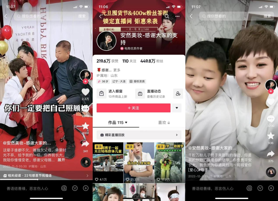 与艺及女王价到的贵妇人设不同的是,安然账号的人设则是一个成长于农村,通过自强不息的草根精神成为一个美业老板的人设,更贴近普通人的生活,其视频内容大多是母慈子孝、孝敬父母等家庭和睦的场景。