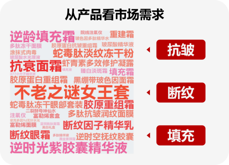 与其有异曲同工之妙的,还有各类胶原蛋白面膜、胶原蛋白填充霜、龙血膏等抗衰产品,都是通过展现视觉化产品质地的方式,吸引用户的注意。