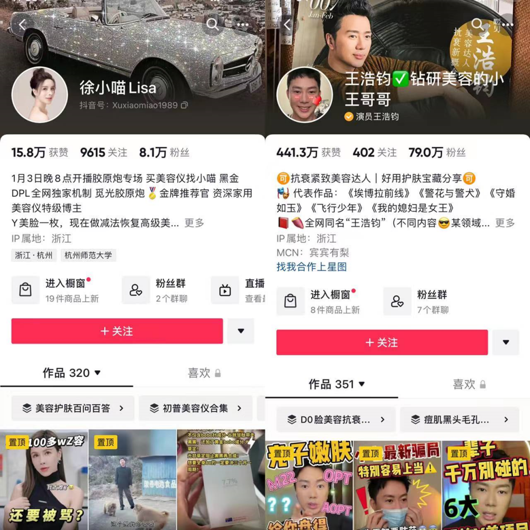 另外2位客单价在千元级的达播账号徐小喵Lisa及王浩钧,则是通过科普医美以各类家用美容仪,以及亲身试用的呈现效果的内容来建立人设。在这2位达人的自我介绍中,自称为“抗衰精致美容达人”及“ 资深家用美容仪特级博主”。