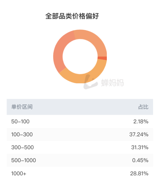 因此,这样一个作为以“豪”形象出现在大众面前的王红权星,吸引的群体相当一部分具有较高的消费能力,促成了他在直播中的销售成绩以及高客单。通过蝉妈妈粉丝分析可以看到,在王红权星的直播间内有28.81%的粉丝消费价格偏好在1000+以上。