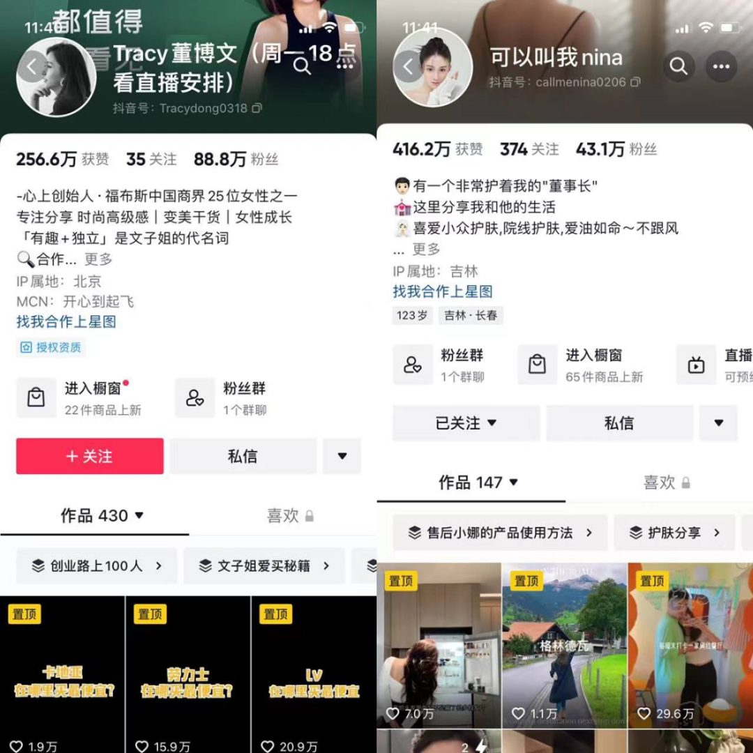 Tracy董博文的人设是某公司创始人,福布斯中国商界女性之一,熟悉劳力士、卡地亚、LV等射频购买渠道;可以叫我nina则是一位受老公宠爱、三亚度假、购买别墅的爱美女士。