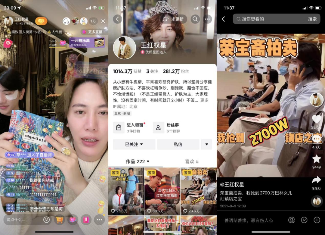 而王红权星的账号内容是怎么样的呢?鸽子蛋大小的珍珠、绿钻和粉钻,以及多个顶级翡翠饰品,还有为母亲在北京购入几千平精装修的庄园豪宅,买房子送的劳斯莱斯,都赚足了短视频用户的眼球。