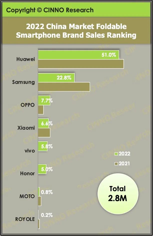 根据CINNO近日发布的数据,2022年中国市场折叠屏手机销量达283万部,同比大幅增长 144.4%。具体到品牌,华为份额为51.8%,保持绝对领先优势。三星虽然以22.8%的份额位列第二,但是OPPO、vivo、荣耀等本土品牌的追赶不可不谓凶猛。