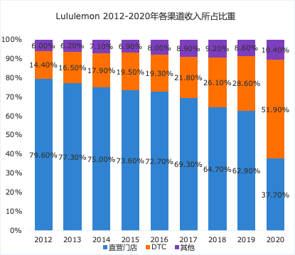 Lululemon并不是唯一开始DTC模式的品牌,但是Lululemon是其中增长最快的,Lululemon的DTC部门在过去4年中的每一年都超过了Lululemon的总收入增长,自2010年以来,DTC部门已为Lululemon的总收入增加了67亿美元,年复合增长率为39.79%,而Nike的数据仅为12.74%。