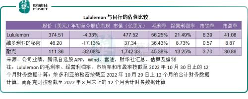 截至2022年10月30日止的12个月,Lululemon的毛利率高达56.25%,是耐克截至2022年8月末12个月毛利率45.38%的1.24倍,是女装品牌维多利亚的秘密截至2022年10月29日止12个月毛利率36.43%的1.54倍。