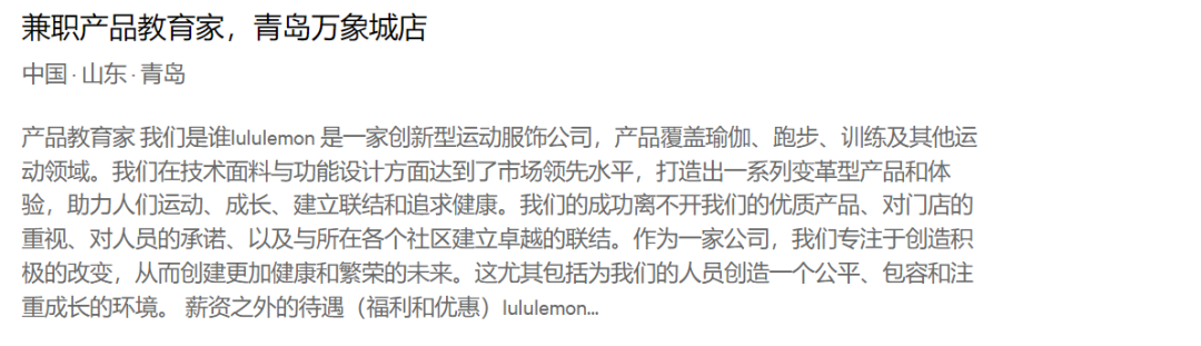 这一系列社区活动都很有利于融入到“社群”的氛围当中,当运动者在社群找到归属感,找到了一种热爱的生活方式,有业内人士评价,Lululemon把重点从产品转向品牌文化的建设正是其高明之处,是维持产品高溢价的关键所在。