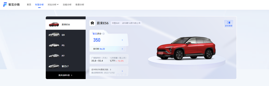 智能座舱与车型的舆情热度以及口碑正负有很强的关联性,但是智能座舱的功能丰富度与整车销量之间,并不存在绝对的相关性。威尔森整车智能化分析平台“智见分晓”,已收录中国汽车市场,所有主流品牌、车型、及智能化亮点功能与细分智能场景,可通过计算座舱功能丰富性和功能稀缺性,从功能广度、功能深度、用户体验、用研洞察、OTA成长性这五个维度,对整车的智能化程度进行综合性评价,例如蔚来ES6得分如下: