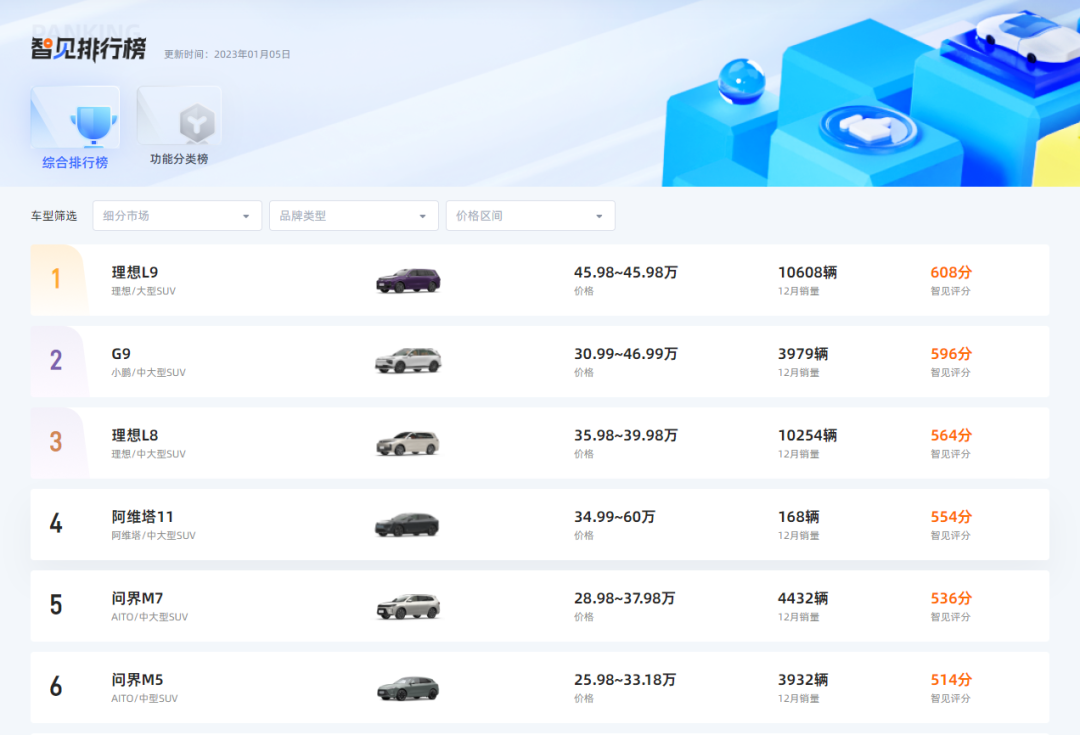 我们利用智见分晓平台和销量数据,进行了以下对比分析:这6款车型的智能化得分都很高,不过销量表现却不相同。其中AITO问界M7自7月上市至今累计销量接近17807台,特别是第四季度月均销量超4000台;M5 2022年累计销量已经突破46090台;理想L9自发布以来,月销过万,也很好承接了理想ONE的销量重担。但是小鹏P7,P5 销量就不尽如人意,自今年7月份以来,销量持续下滑,两个车型较上半年销量下跌超35%。