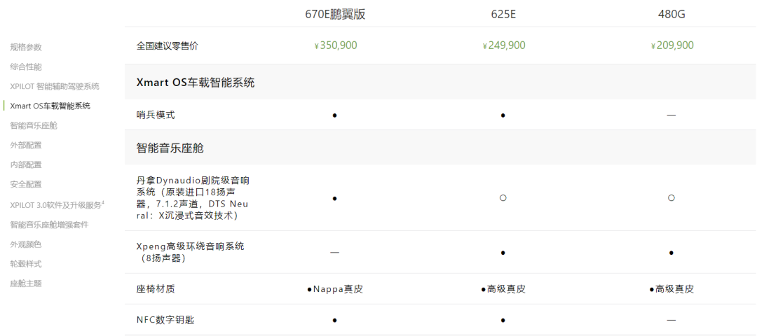 我们对比小鹏高中低三款车型发现,售价在21万的480G智能化程度大打折扣。一些我们认为在这个价格区间相对基础的智能化功能如哨兵模式,NFC数字钥匙等也没有装备,主打音乐座舱智享空间概念的高级音响系统也仅在顶配车型标配。