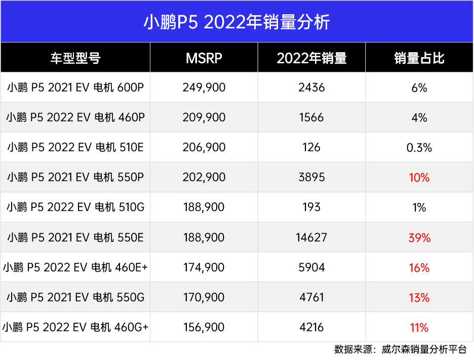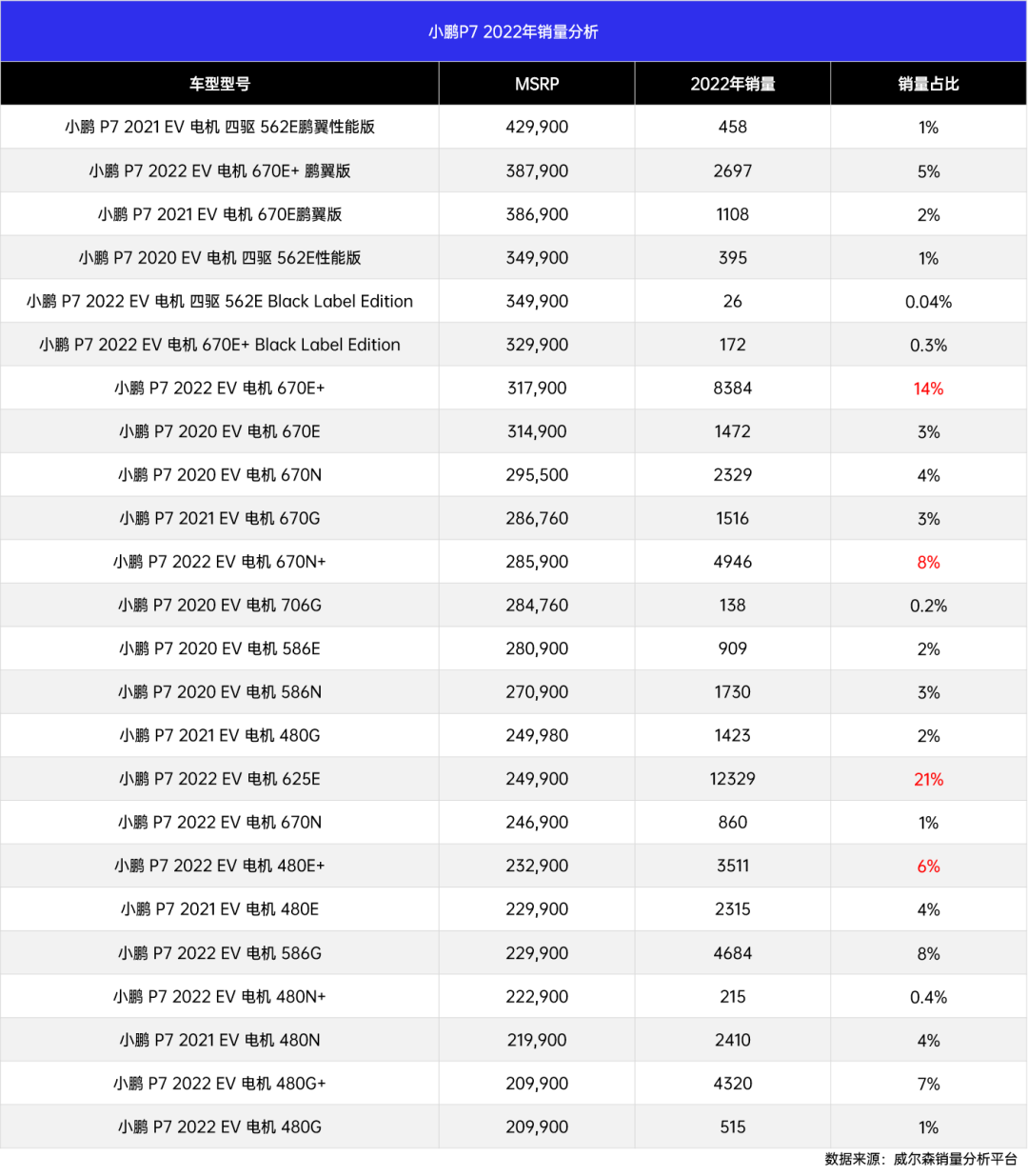 关键在于,通常低价走量的低配版本如480G,销量占比在30% 以下,使得小鹏P7整体销量结构呈现出中间多两边少,而不是正常的金字塔型。