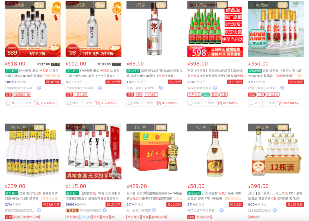 当然,这并非白酒发展史上第一次出现高价光瓶酒,在此之前,72度五粮液原度酒在光瓶酒市场早有盛名,单瓶流通价超过4000元;李渡2015年推出的52度李渡高粱1955一路从380元/瓶涨至千元以上。在此之后,泸州老窖黑盖、红星大曲酿、献礼版玻汾、舍得T68、光良、江小白金盖等一批高线光瓶酒打开50-100元价格带,甚至更有泸州老窖“高光”系列杀入光瓶酒“轻奢”市场。