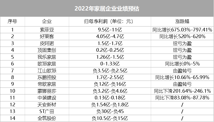 - 14家企业发布业绩预告,皮阿诺、顶固集创、我乐家居扭亏为盈
