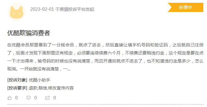 黑猫投诉上的这条2月1日的用户投诉从侧面验证了优酷的官方回复,确实有相关页面告知规定。