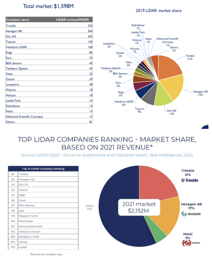 2019年,Yole统计了美国激光雷达公司市场份额排名。排除Trimble、Hexagon、Sick AG、Topcon这些搞测绘的公司,车载雷达排第一的是Velodyne,禾赛排在Waymo、Robosense(速腾)等几家后面,位列第七,只有1%的份额。
