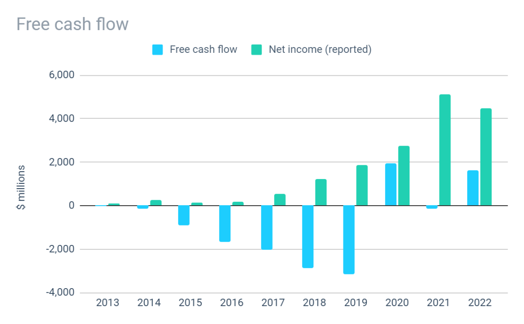 2022年一季度的用户新增停滞对管理层是当头棒喝,公司立即意识到业务发展的关键方向已经开始发生了变化,再不能像以前一样高举高打进行扩张,需要谨守现有的用户群量入为出了。于是,2022年的自由现金流又重新转为正向。