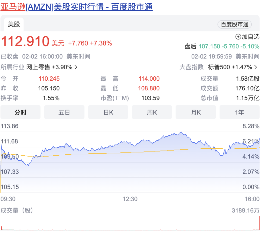 财报显示,2022年第四季度,亚马逊营收约1492亿美元,同比增长9%;归母净利润为2.78亿美元,同比下降98%。财报发布后,亚马逊在盘后交易中股价一度下跌5%,但随后又有所反弹。