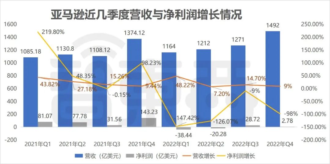 2022年第四季度,亚马逊营收约1492亿美元,同比增长9%;归母净利润为2.78亿美元,同比下降98%,这延续了第一季度、第二季度的下跌趋势。