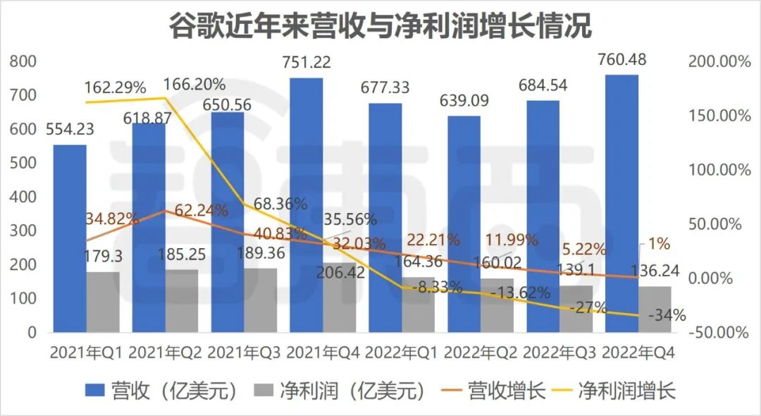 谷歌母公司Alphabet第四季度财报显示,其营收为760.48亿美元,同比增长1%;净利润从一年前的206.42亿美元降至136.24亿美元,同比下跌34%,这是其八个季度以来的最大跌幅。