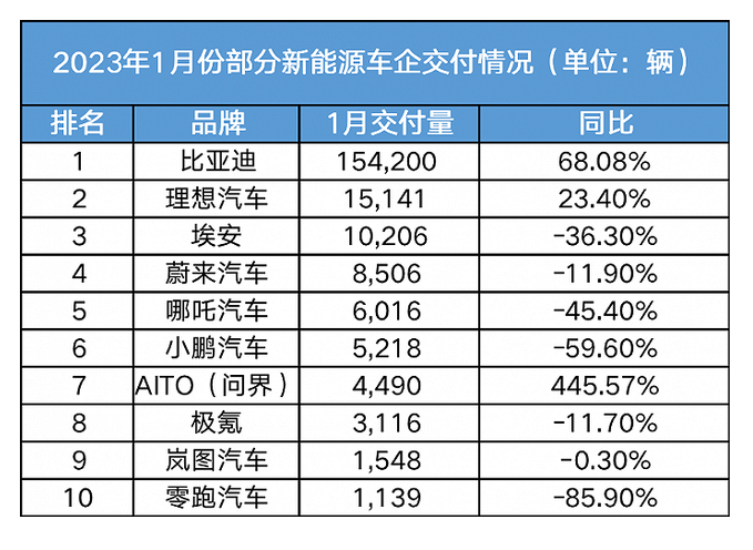 但值得注意的是,包括以上三家车企,几乎整个新能源车市场都在1月出现了不同程度的销量环比下滑。特斯拉通过降价抢走了部分市场固然是原因之一,此外,因为大部分车企都已经赶在2023年新能源汽车补贴退出前透支了销量,在12月的高基数前,1月销量不理想也是意料之中。