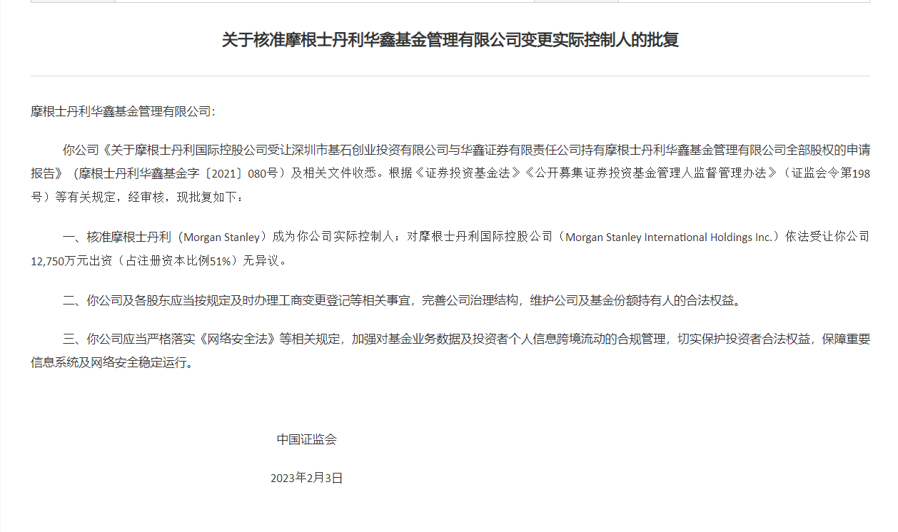2月3日,证监会网站信息显示,核准摩根士丹利成为摩根士丹利华鑫基金实际控制人;对摩根士丹利国际控股公司(Morgan Stanley International Holdings Inc.)依法受让摩根士丹利华鑫基金1.28亿元出资(占注册资本比例51%)无异议。