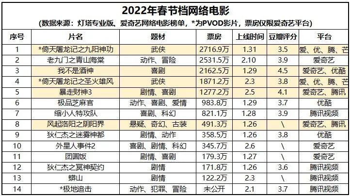 但即便如此,今年网络电影春节档新片数量仍是近三年来最少的一届,爱优腾芒四家平台相加也不过9部新片,远低于2021年的20部+和去年的14部。不过与院线市场相比的话,网络院线供给数量还是更加饱和。
