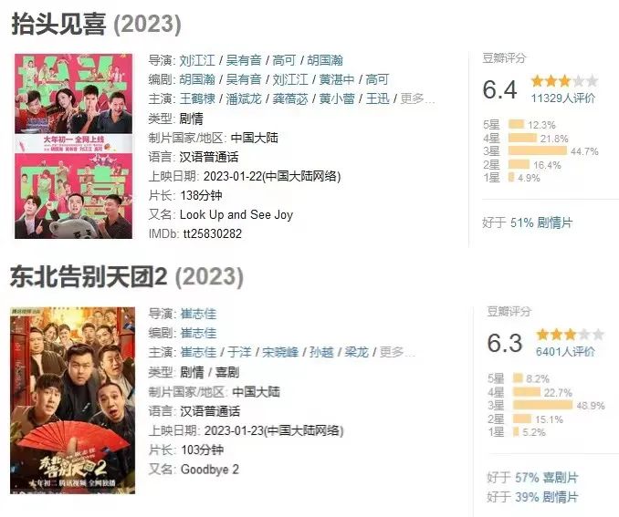 目前已开分的6部影片中,《抬头见喜》《东北告别天团2》两部喜剧的豆瓣评分分别达到了6.4和6.3,创造了近三年春节档网络电影的口碑新高。在优质口碑的推动下,两部影片的分账票房也都顺利突破了千万关口。